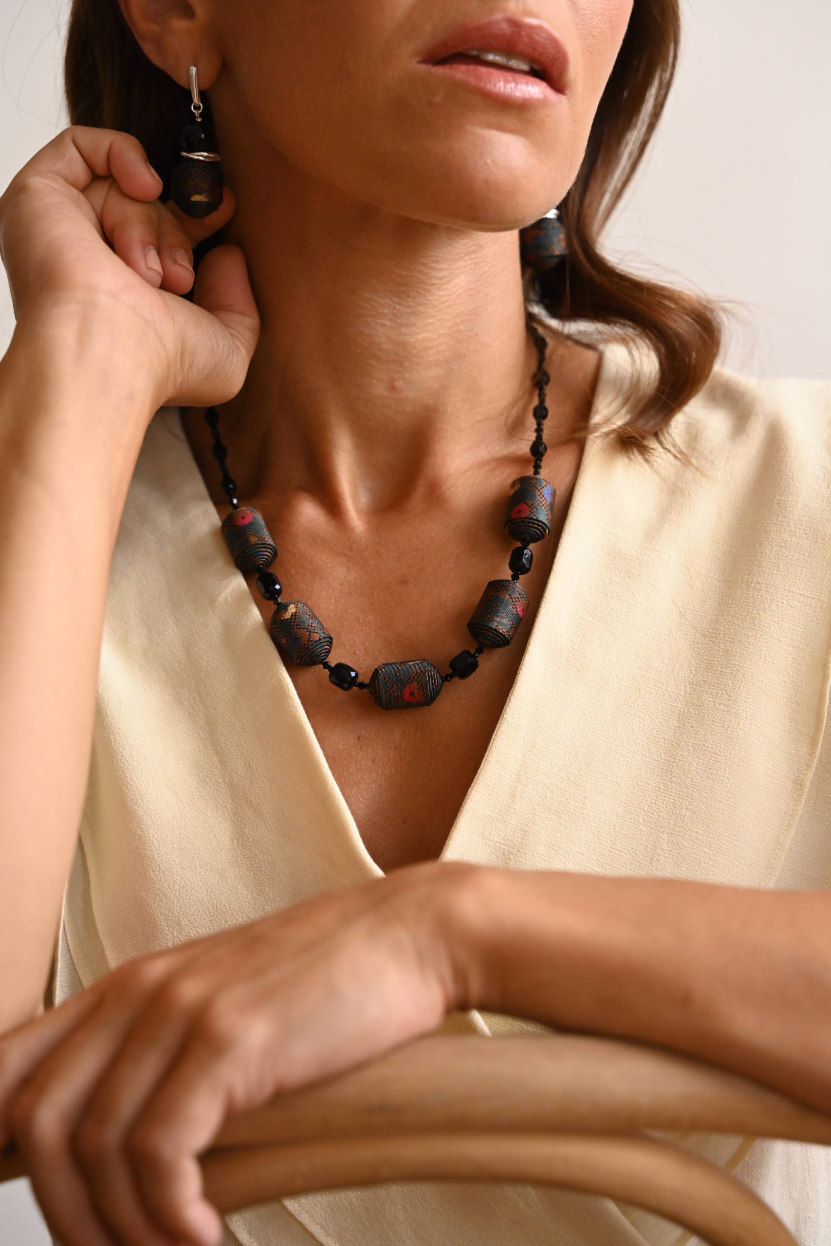 Caractéristiques : Perles de soie créées avec une cravate en soie Pierre Balmain Coloris : multicolore, bronze, or, vert bouteille, bleu azur , jaune et rouge intense Perle noire en verre de Bohême Fermoir en argent 925 pour oreilles percées Fermoir clip en argent 925 disponible sur demande Hauteur totale de chaque boucle d’oreille : 5 cm Pièce unique Pour toute commande d’une création sur-mesure avec votre soie contacter la créatrice Votre bijou est emballé avec soin dans un écrin et accompagné de son certificat d’authenticité