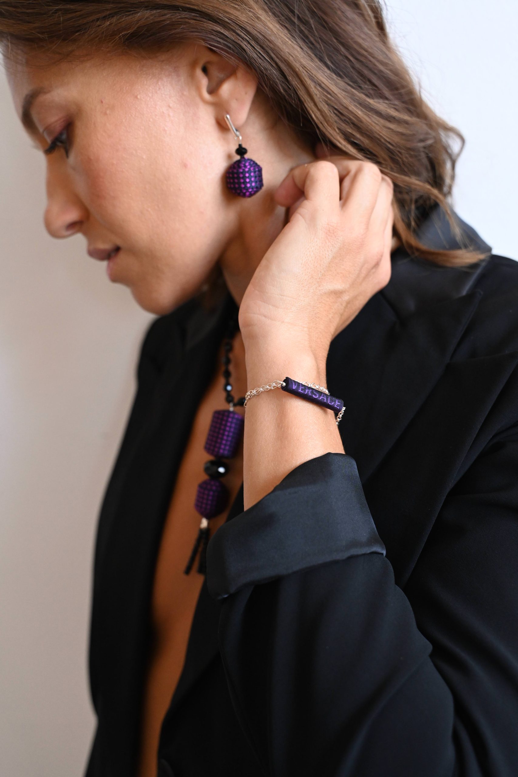 • Perle de soie créée avec la soie intérieure de la pointe d'une cravate Versace