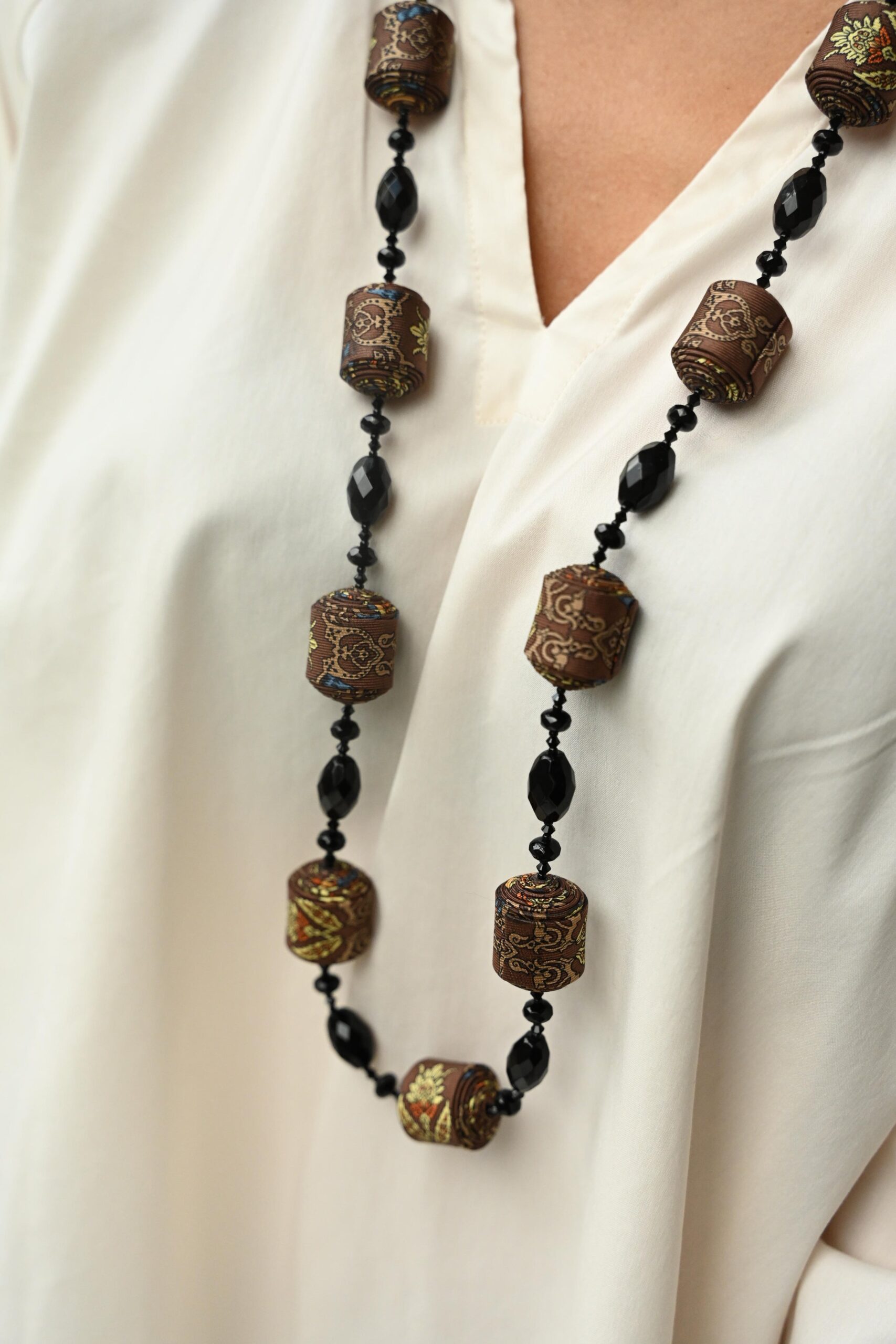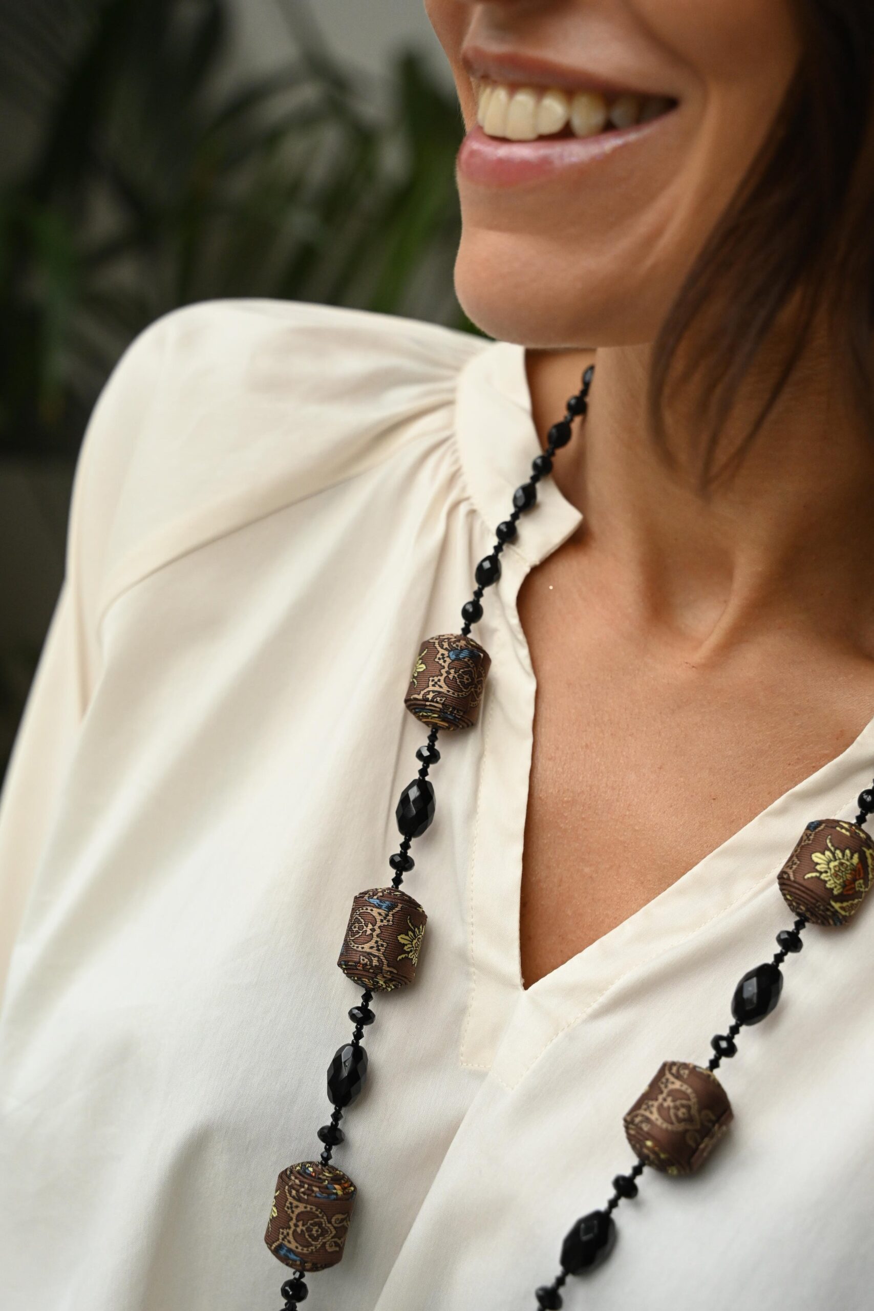 Le noir intense du cristal de Swarovski, transmet une vivacité et une énergie artistique à l’ensemble. Chaque détail soigneusement pensé, crée une harmonie entre la finesse des perles de soie, la gaieté des couleurs et les motifs.