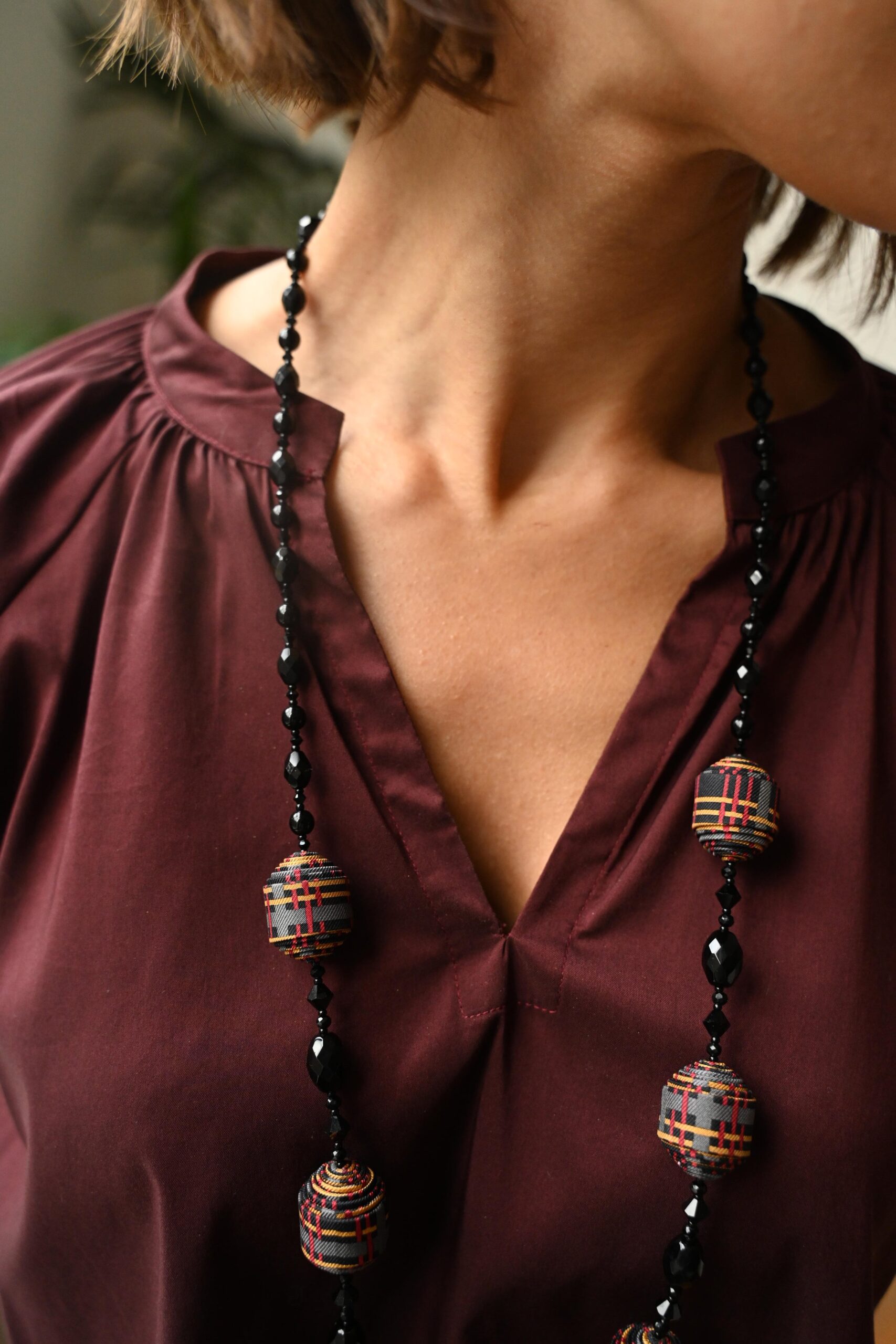 Le noir intense du cristal de Swarovski, transmet une vivacité et une énergie artistique à l’ensemble. Chaque détail soigneusement pensé, crée une harmonie entre la finesse des perles de soie, la gaieté des couleurs et les motifs.