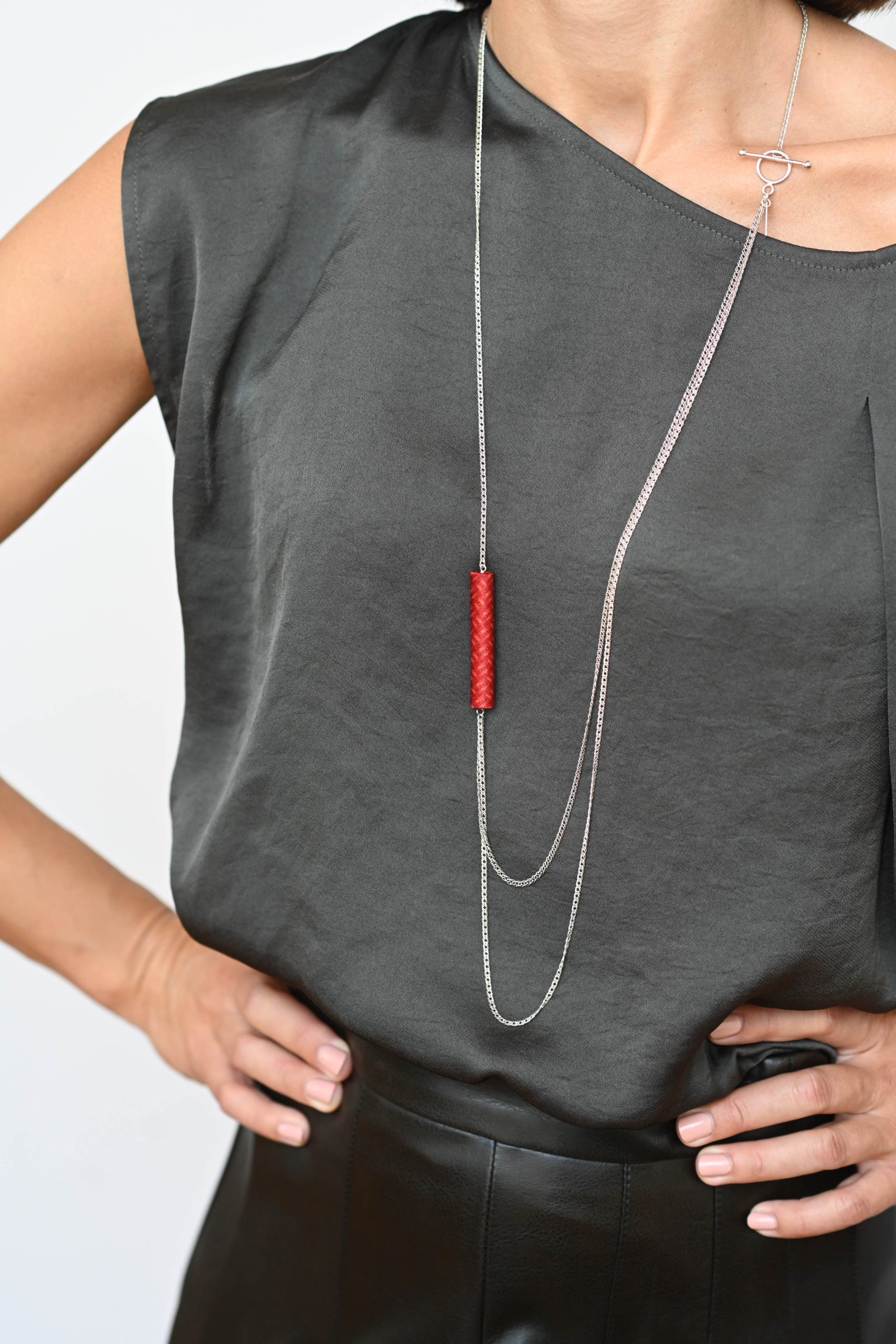 Les lignes minimalistes de ce sautoir lune, son fermoir en T placé en asymétrie et sa perle baguette en soie apportent à vos tenues une touche d’originalité et de couleur. Un collier sculptural, moderne et discret, à porter tous les jours, en toutes occasions !