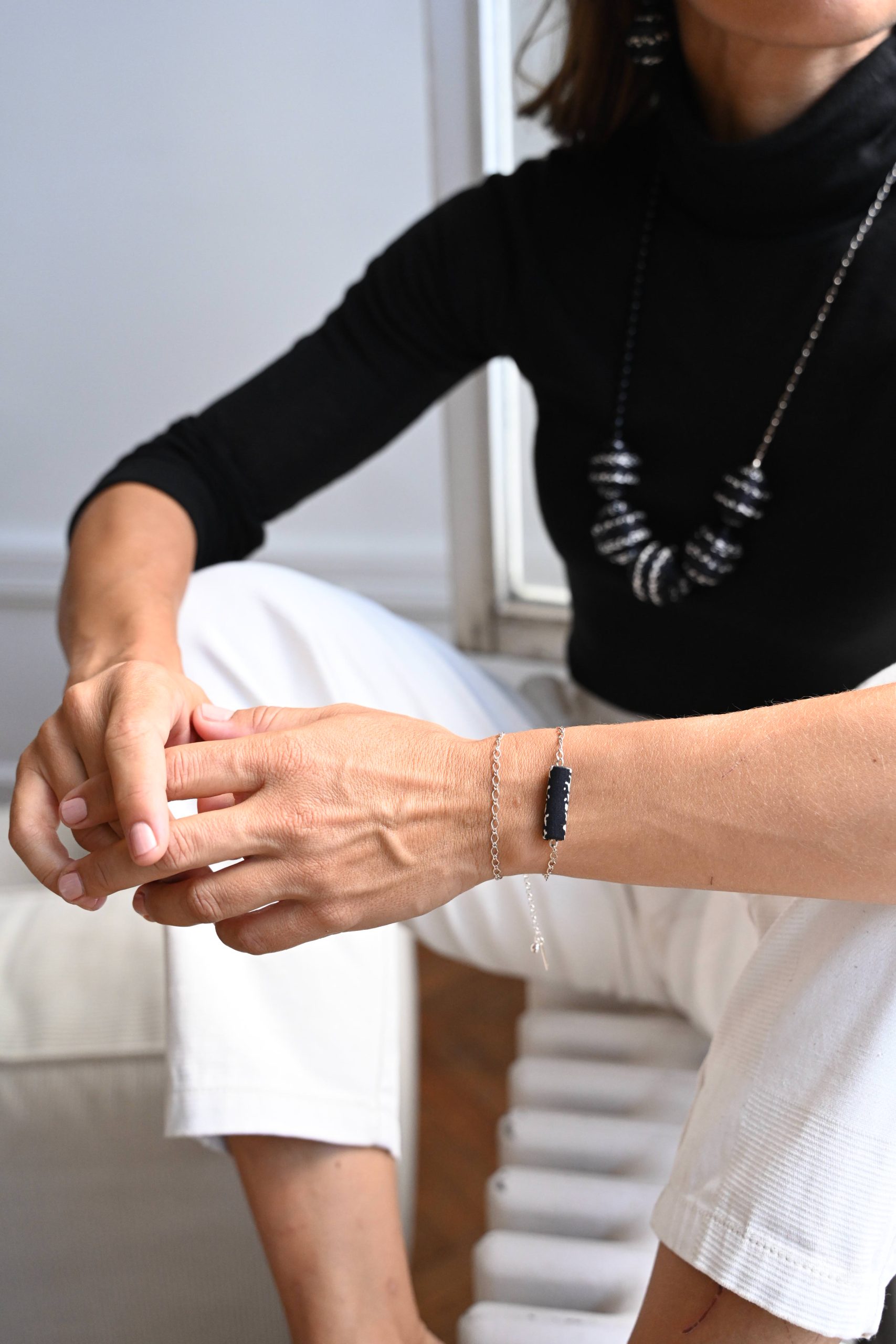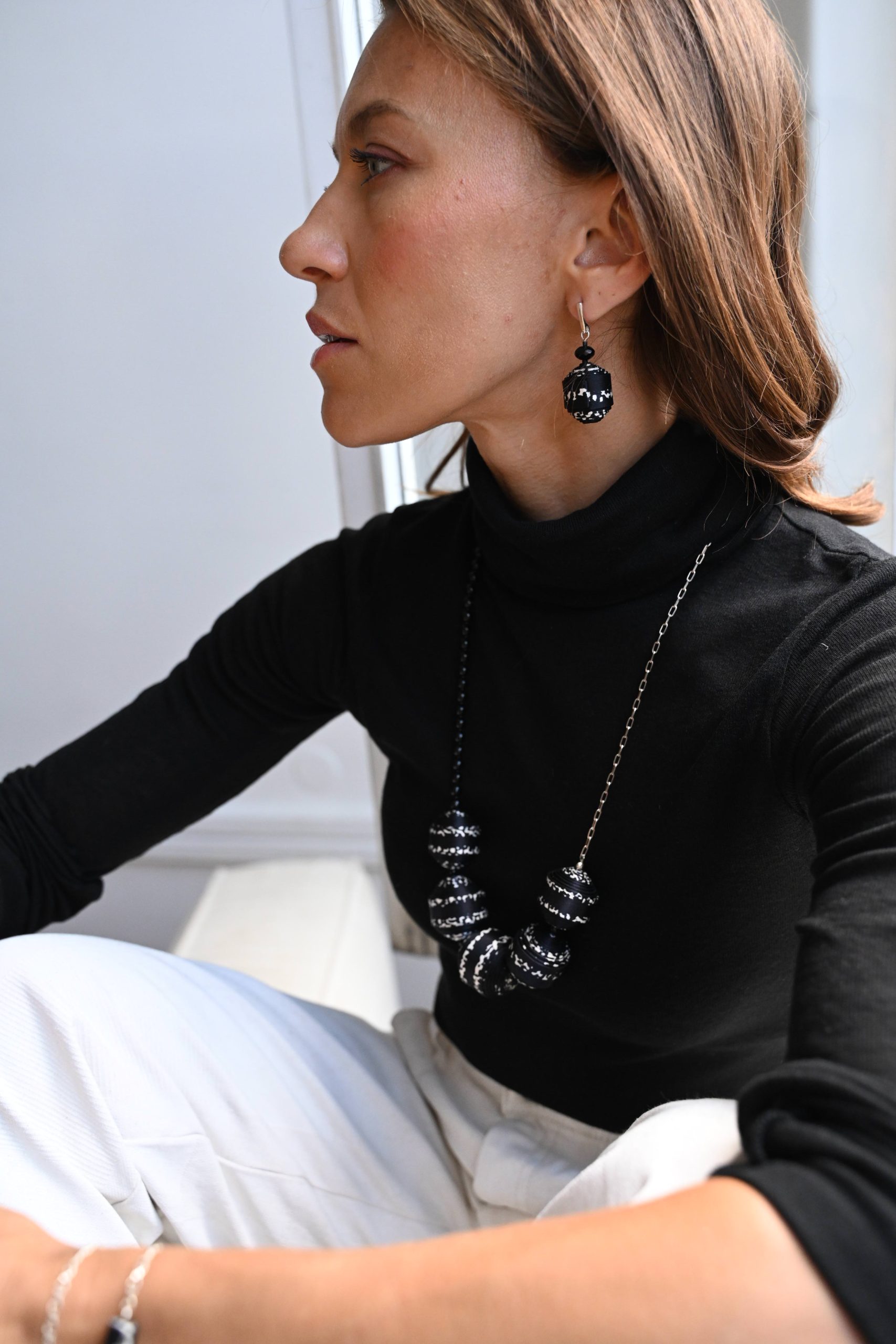 Le noir intense du cristal de Swarovski, transmet une vivacité et une énergie artistique à l’ensemble. Chaque détail soigneusement pensé, crée une harmonie entre la finesse des perles de soie, la gaieté des couleurs et les motifs.