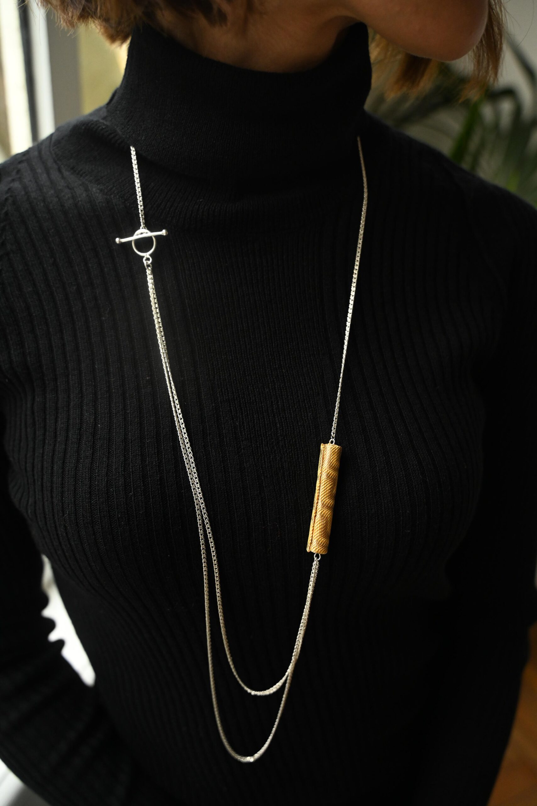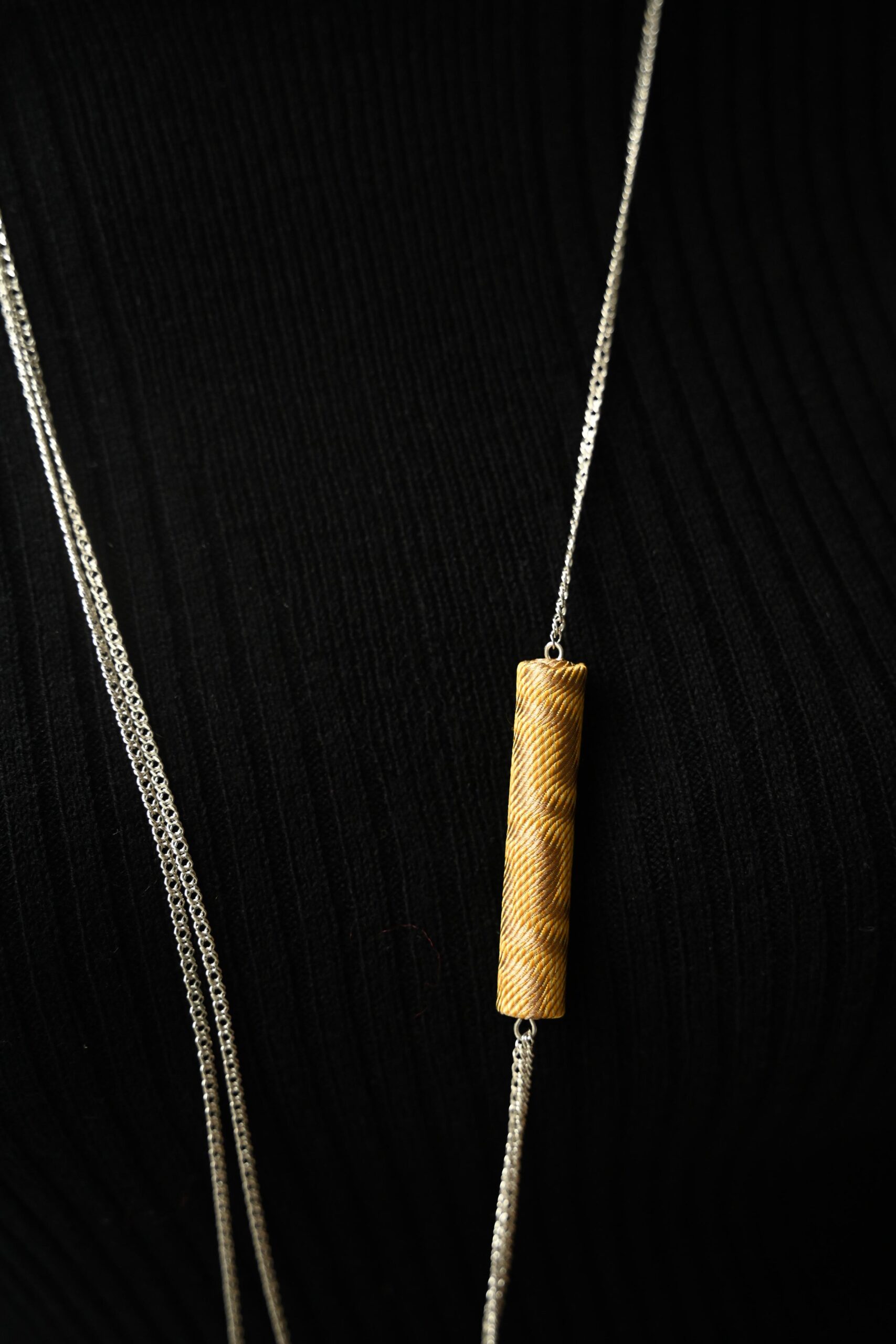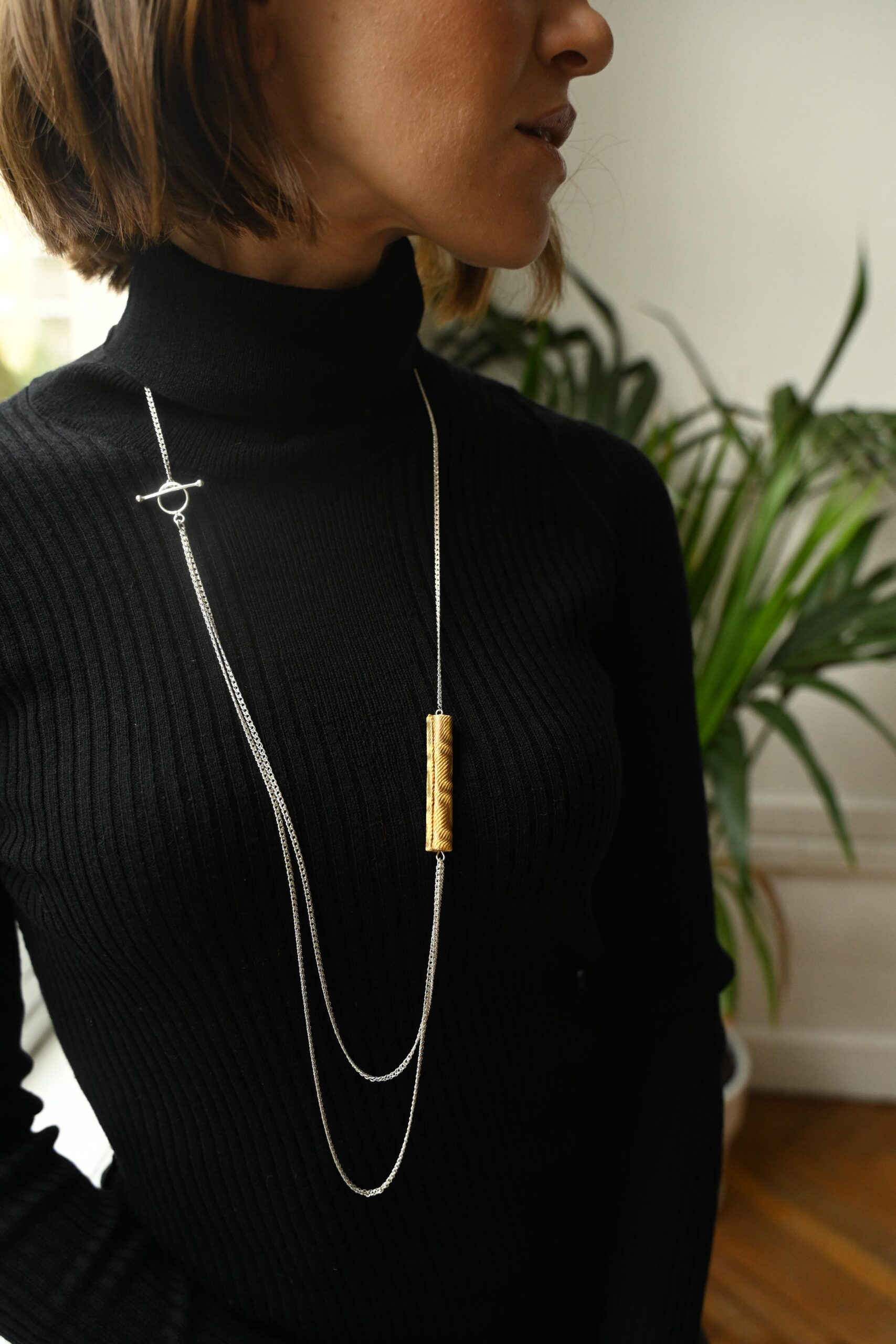 Les lignes minimalistes de ce sautoir lune, son fermoir en T placé en asymétrie et sa perle baguette en soie apportent à vos tenues une touche d’originalité et de couleur. Un collier sculptural, moderne et discret, à porter tous les jours, en toutes occasions !